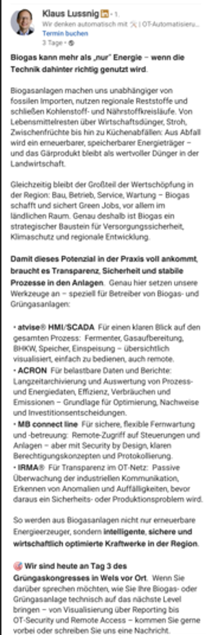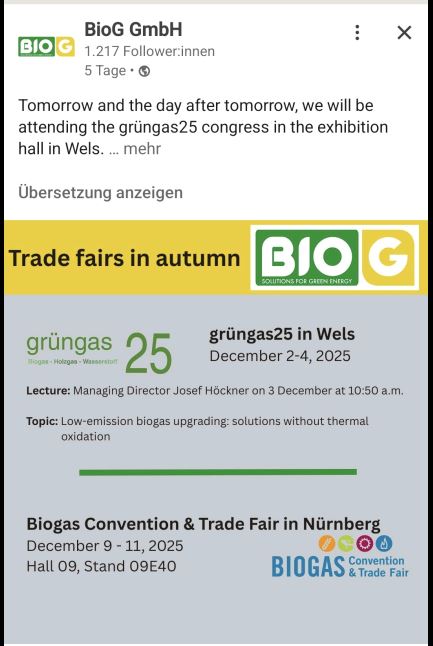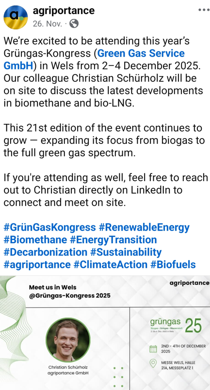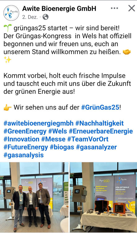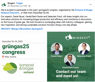 Die Green Gas Service GmbH veranstaltete in Kooperation mit dem Kompost und Biogas Verband Österreich, sowie der WK OÖ vom 2. bis 4.12.2025 den 3-tägigen Grüngas-Kongress in der Messe Wels.